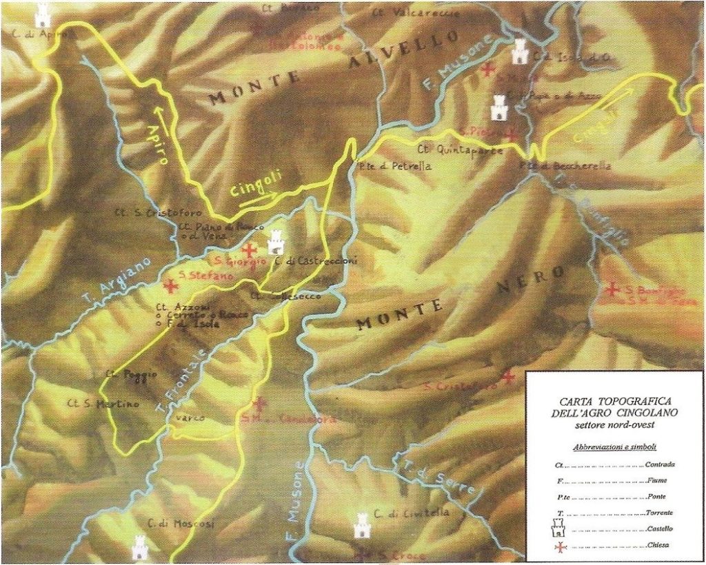Tavola Storico – Topografica del settore nord-occidentale del territorio di Cingoli, in cui sono posti in evidenza i Castelli di “Castreccioni \ e quello sul ponte della Beccherella di “Ripa o di Azzo”: le due chiese ben distinte di San Giorgio e quella di San. Stefano, della contrada di Azzoni.